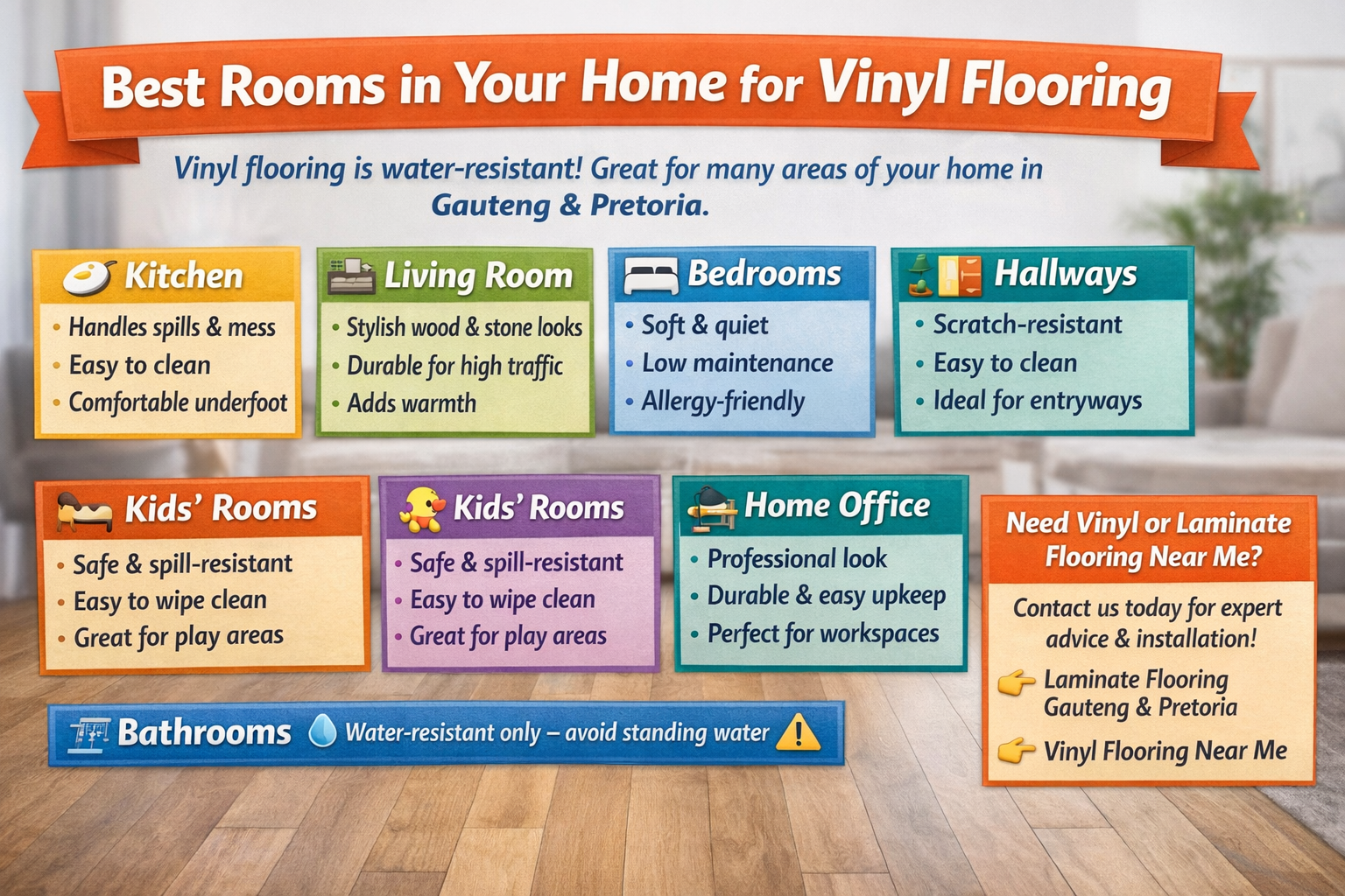 If you’re searching for vinyl flooring near me, or comparing options like laminate flooring Gauteng and laminate flooring Pretoria, this guide will help you choose the right rooms ๐